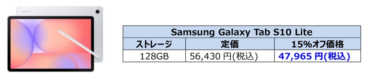 | Galaxy Tab S10 Lite | 128GB | 56,430円 | 15% | 47,965円 |