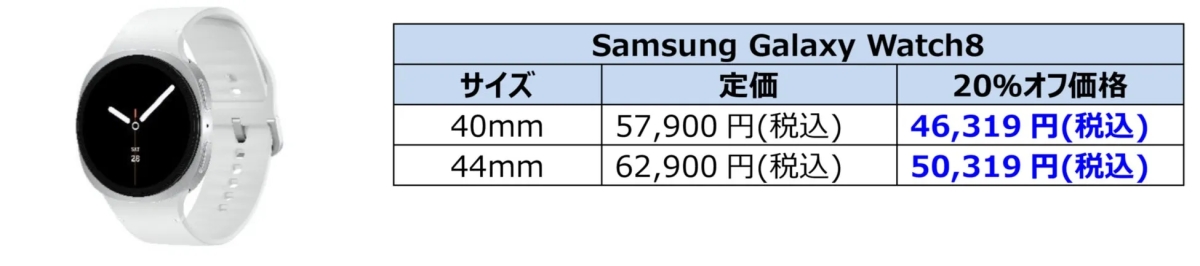 | Galaxy Watch8 | 40mm | 57,900円 | 20% | 46,319円 |