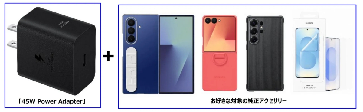 実店舗で対象のスマートフォン製品を購入すると、「45W Power Adapter」と選べる純正アクセサリーがもらえるという、非常に魅力的な特典があります。
