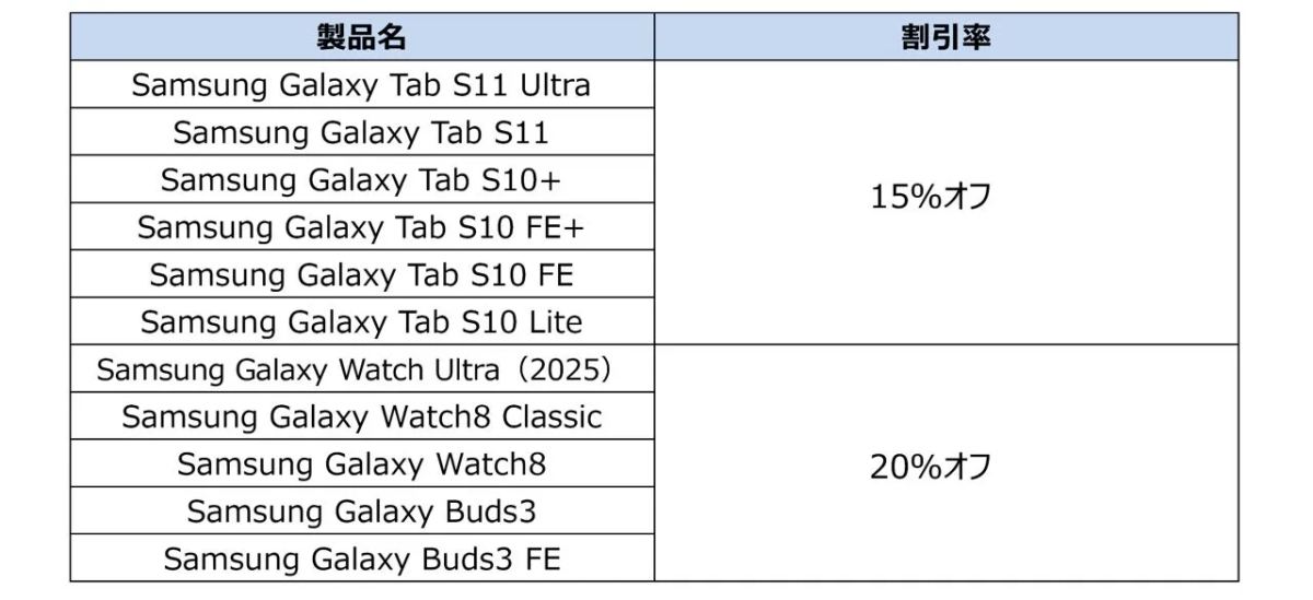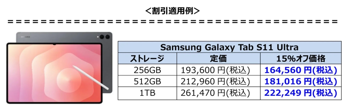| Galaxy Tab S11 Ultra | 256GB | 193,600円 | 15% | 164,560円 |