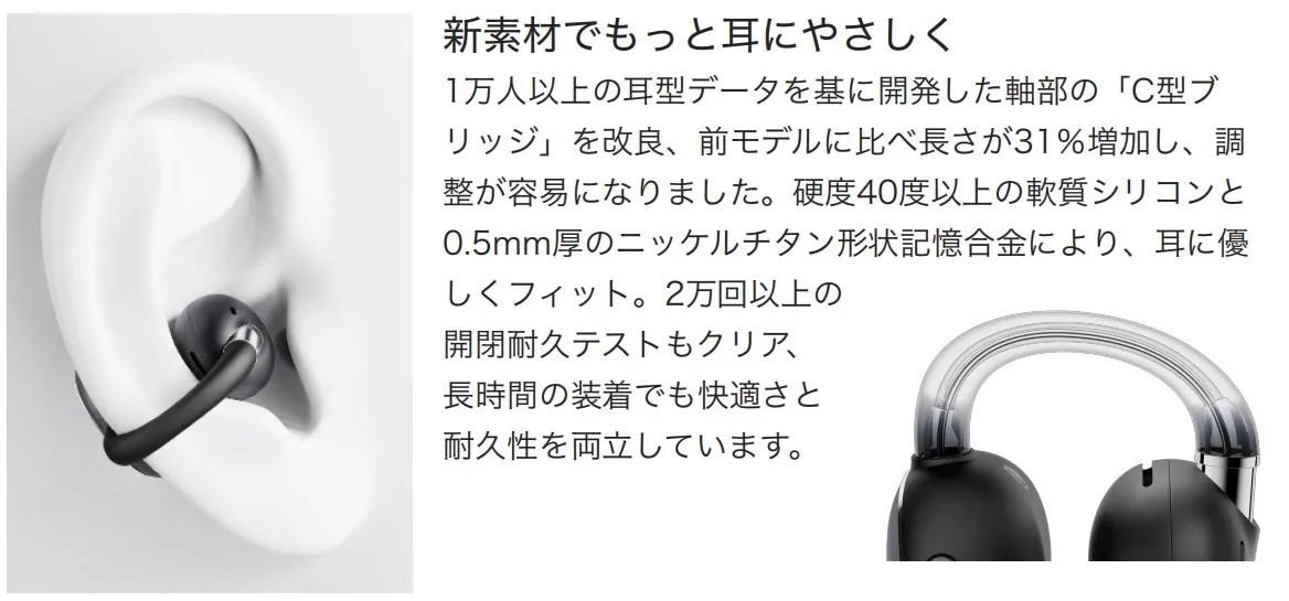 - ・耳に優しい抱擁:硬度40度以上の軟質シリコンと、0.5mm厚のニッケルチタン形状記憶合金という素材の組み合わせは、耳への負担を極限まで減らしてくれます。長時間つけていても、まるで何もつけていないかのような快適さを実現しています。