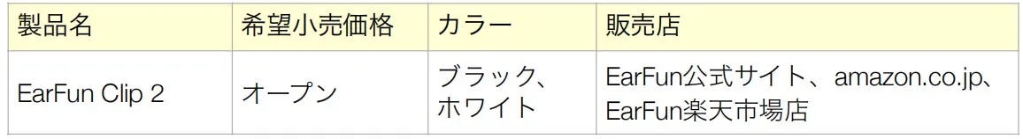 | EarFun Clip 2 | オープン | ブラック、ホワイト | EarFun公式サイト、amazon.co.jp、EarFun楽天市場店 |