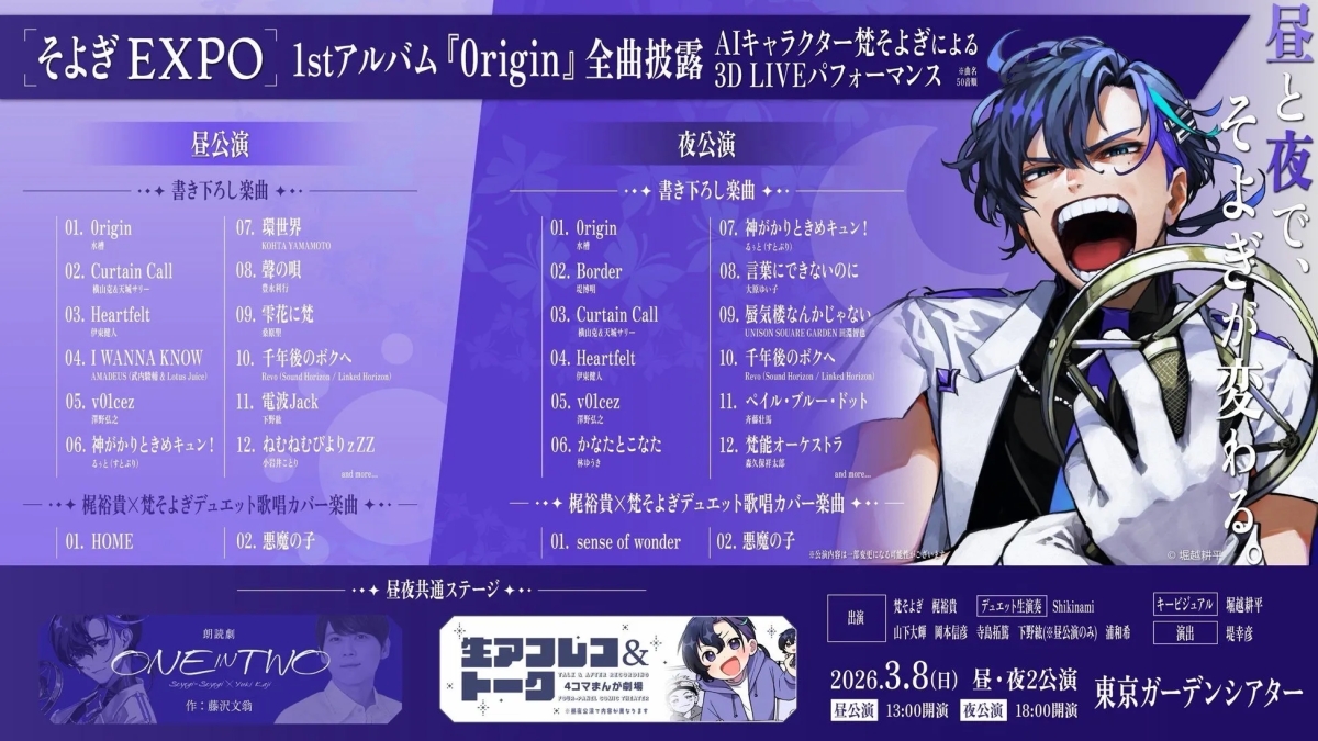 イベント告知画像からは、昼夜公演で異なるステージ内容が用意されていることが見て取れます。「昼と夜で、そよぎが変わる。」というキャッチコピーも、期待感を高めるポイントです。全曲披露される1stアルバム『Origin』の楽曲ラインナップには、豪華なクリエイター陣の名前がずらり。これは音楽ファンにとっても見逃せない内容になるでしょう。