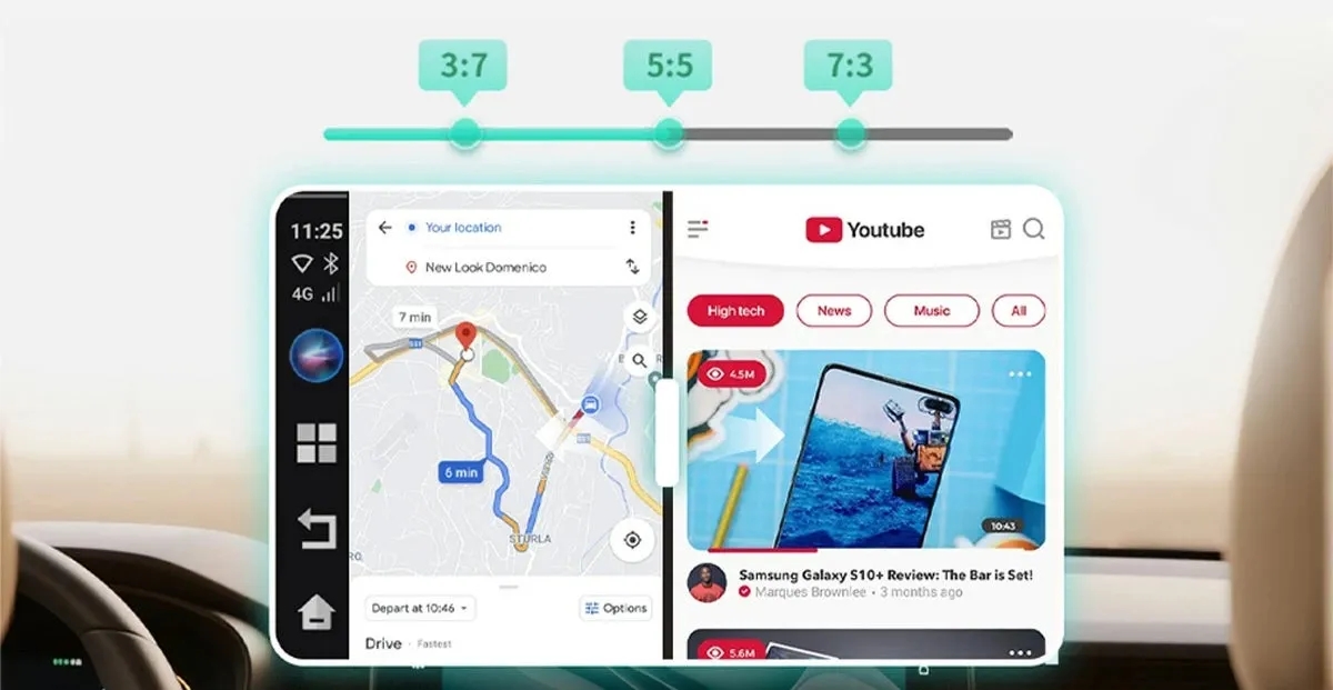 画面分割の比率も「3:7」「5:5」「7:3」 から自由に選択可能です。例えば、運転手用にナビを大きく表示しつつ、助手席用に動画を流すなど、状況に応じた使い分けができます。これはまさに、車内がプライベートな「動くシアター」に変わる瞬間と言えるでしょう。