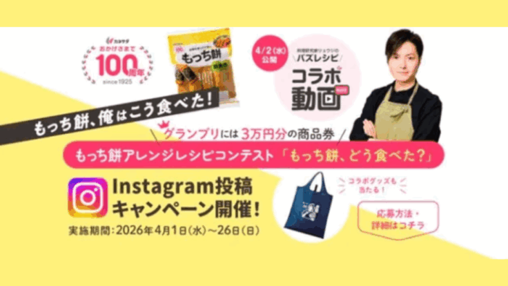 - STEP3: ハッシュタグ「#もっち餅2026」「#カネサダもっち餅」を付け、本文内で公式Instagramアカウント