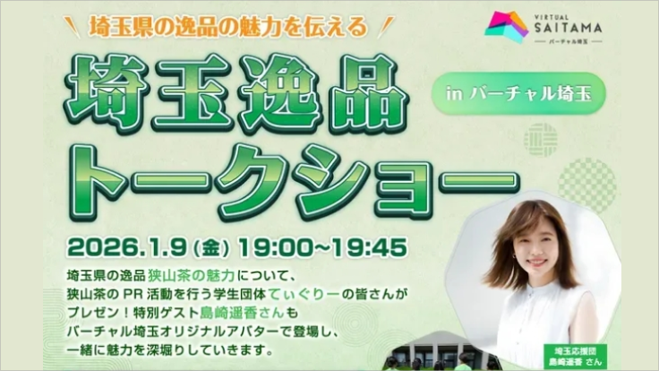 「埼玉逸品トークショー in バーチャル埼玉」は、メタバース空間を活用し、埼玉県の魅力である狭山茶を多角的に体験できる画期的なオンラインイベントです。2026年1月9日に開催され、島崎遥香さんや学生団体「てぃぐりー」の皆さんが、狭山茶の新しい世界を深掘りします。