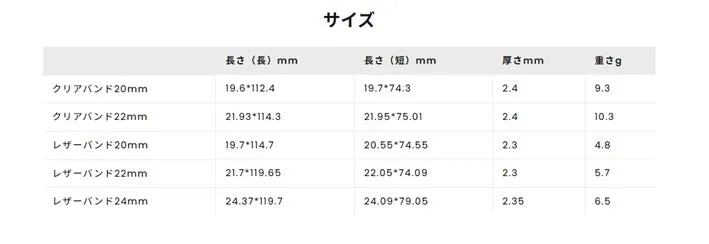 Apple Watch、Galaxy Watch、Garminなど、さまざまなスマートウォッチに対応するバンドです。クリアタイプは軽やかでカジュアルに、レザータイプは高級感がありフォーマルにも合わせやすいのが特徴です。