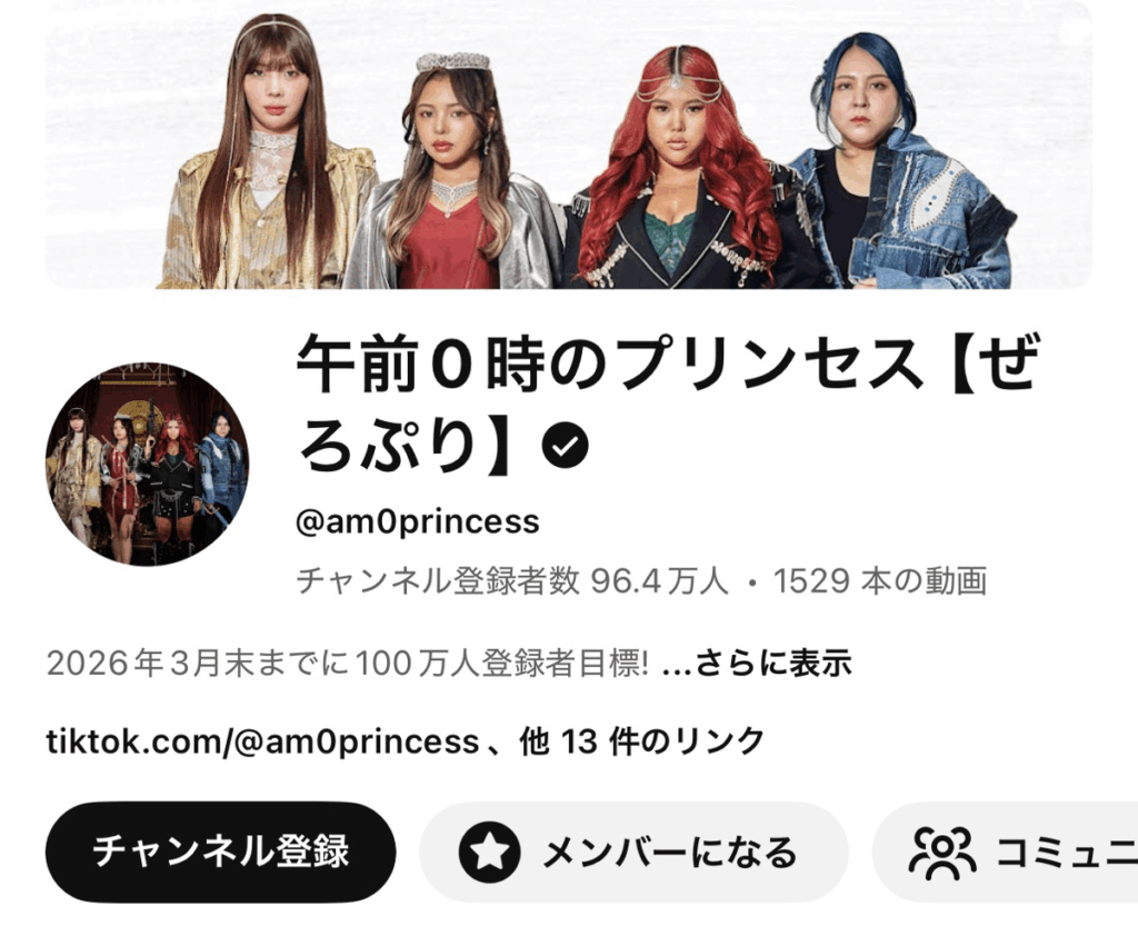 「午前0時のプリンセス【ぜろぷり】」は、現在(2026年3月)YouTubeチャンネル登録者数約96万人の4人組クリエイターです。